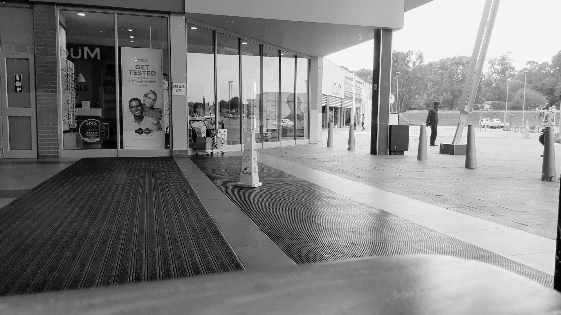 The glasses? The bed shop in the background? The warning cone telling you not to slip on the wet floor? Going through this image (or others) and looking for details stimulates your eye.